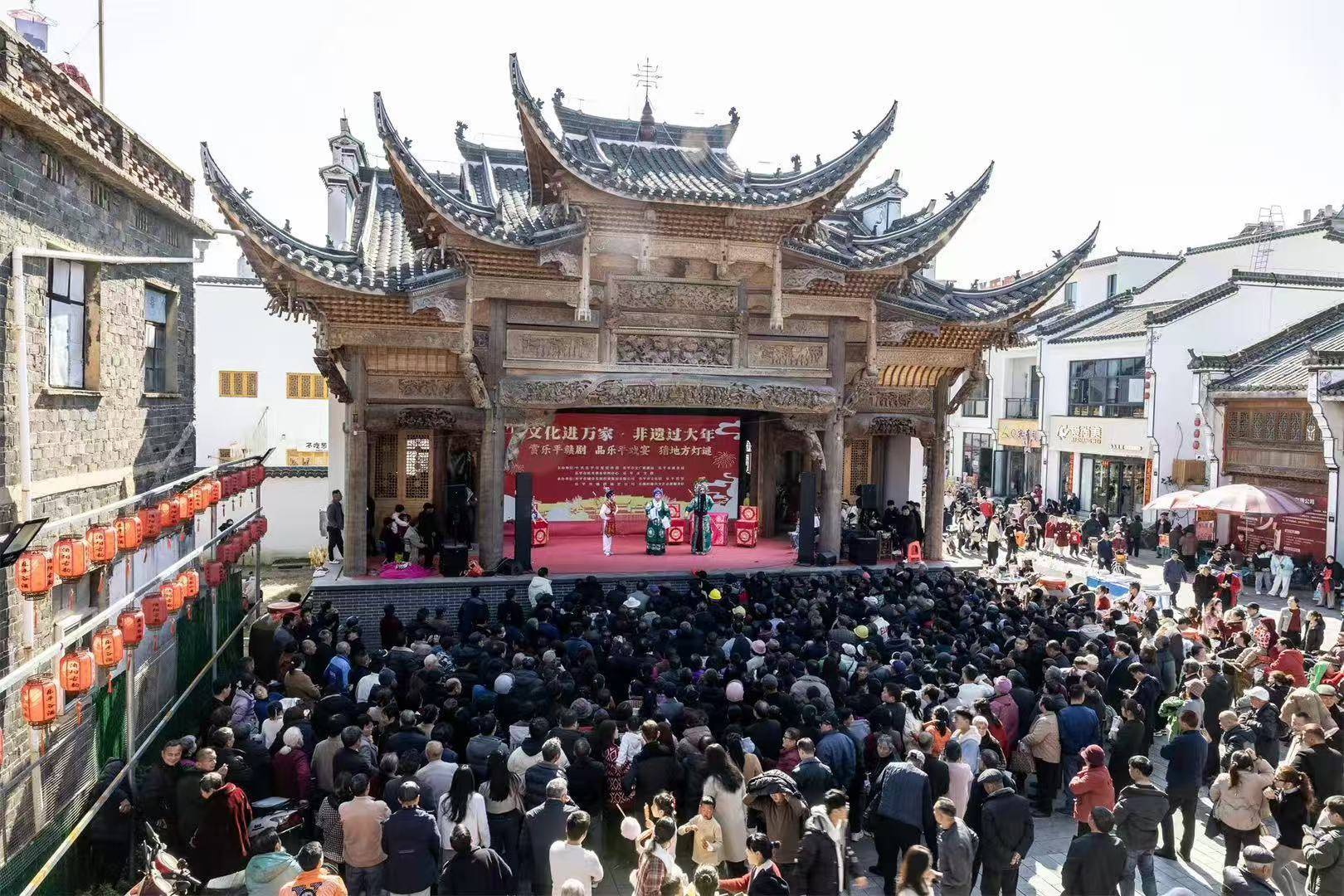 江西乐平市老北街古戏台,“非遗过大年”赣剧惠民专场演出现场。新华社发热闹的背后,离不开那遍布城乡的五百余座古戏台。飞檐斗拱、雕梁画栋。走进乐平市乐港镇塔瑞村,73岁的村民吴乃富站在戏台前说:“一侧是戏台,正对着的就是祠堂,这里就是我们的根。”